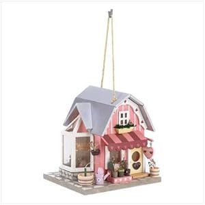 Add a whimsical bit of old-style romance to your garden with this heartwarming love nest! Enchantingly detailed to bring to mind a quaint village flower shop, with gingerbread trim, sweet pink walls and an assortment of flowers to brighten the cobblestone patterned porch. Adorable! Wood. 6 1/4 inches x 8 inches x 7 1/4 inches high.