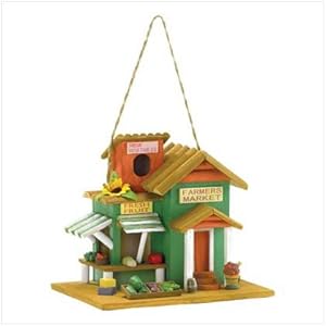 Those roadside vendors that yield such yummy garden treats in summer, can also house the season?s crop of baby birds, with this fun, Farmer?s Market decorative birdhouse. Where the growers gather, there?s sure to be a bumper crop, so get ready for this season?s ?plantings? with this colorful outdoor décor accent for your backyard or garden. Wood with polyresin trim. 9 1/2 x 7 3/4 x 10 inches.